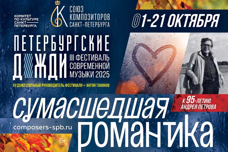 В Санкт-Петербурге стартует III фестиваль современной музыки «Петербургские дожди», который пройдет с 1 по 19 октября в залах Государственной Академической Капеллы, Эрмитажном театре Государственного Эрмитажа и Дубовом зале Союза композиторов Санкт-Петербурга.